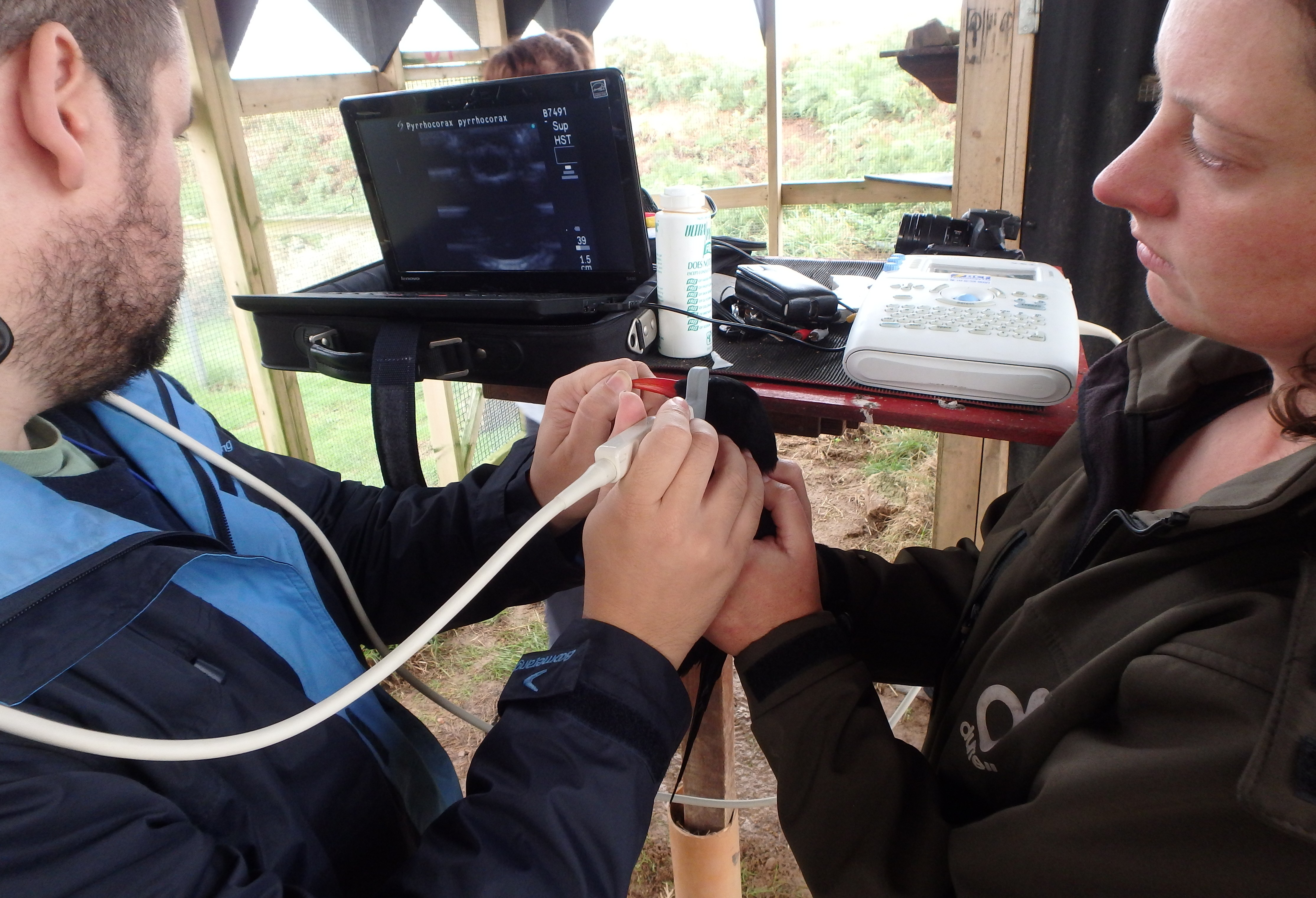 OLYMPUS DIGITAL CAMERA Published November 17, 2014 at 4458 × 3041 in Chough report: October 2014 Durrell vet, Alberto Barbon, performing an ultrasound on a Jean’s eye. Photo by Harriet Clark